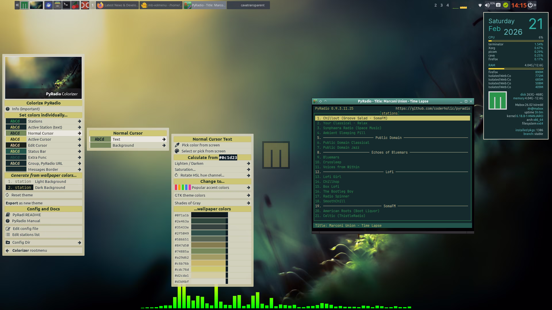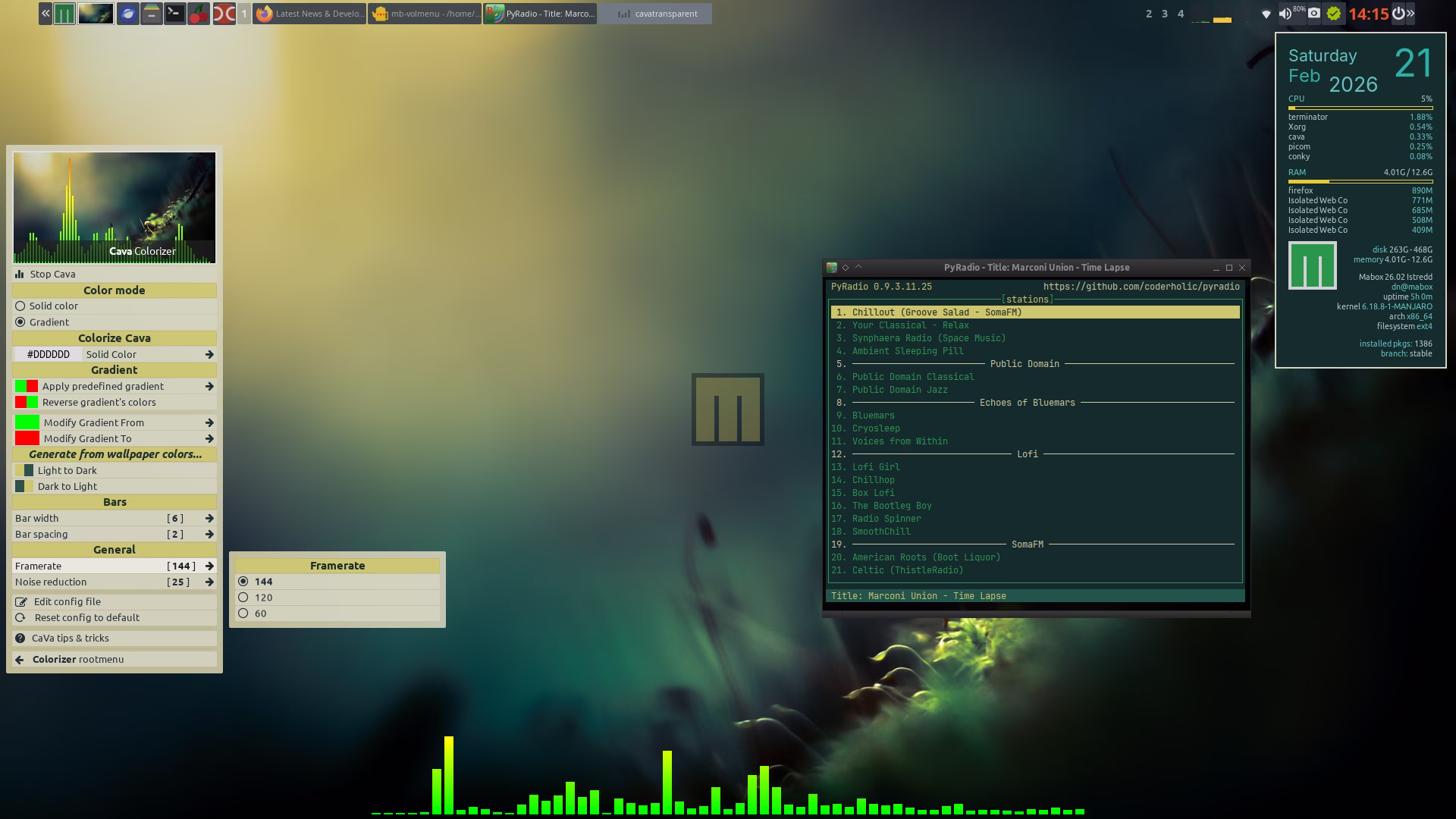 Cava is placed in transparent terminal window without decoration. But still you can resize and move this window like any other: A - Left mouse click - drag - to move A - Right mouse click - drag - to resize