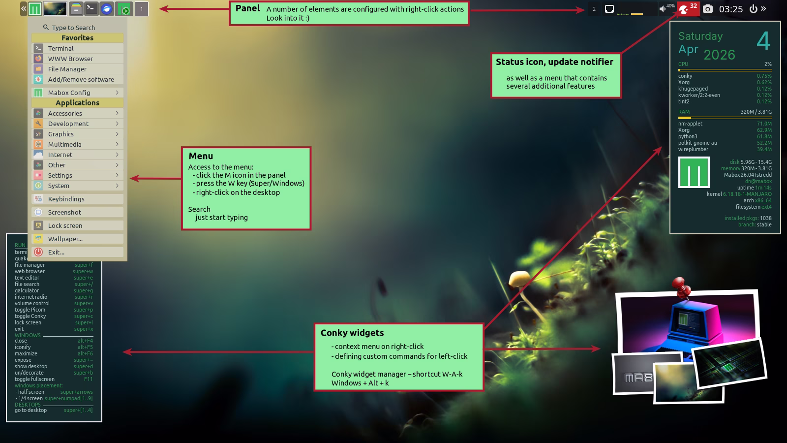 Key components of the Mabox desktop.