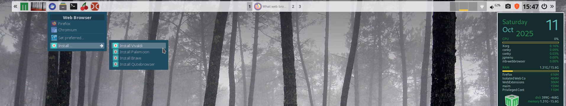 Firefox. And anyway Mabox offers a choice of browsers in the āinstall popular applicationsā menu. So i think itās good to stay with what exists now and continue with Firefox.